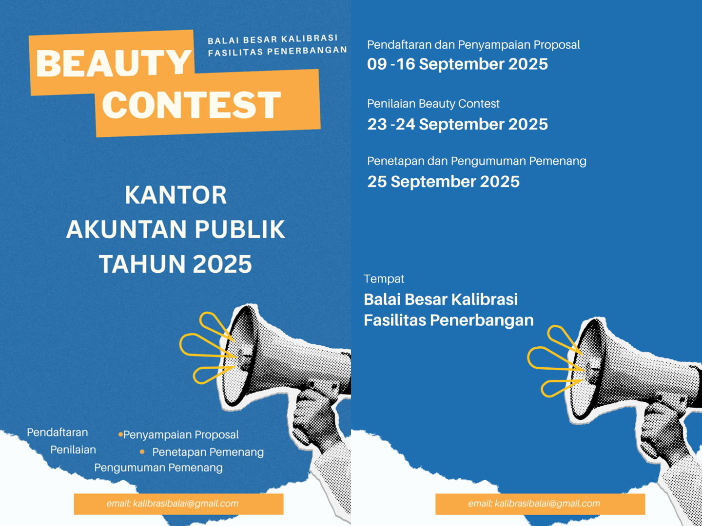 BLU Balai Besar Kalibrasi Fasilitas Penerbangan telah melaksanakan Beauty Contest pemilihan Kantor Akuntan Publik Tahun Anggaran 2025 dan menyampaikan hasil penilaian Beauty Contest dim...